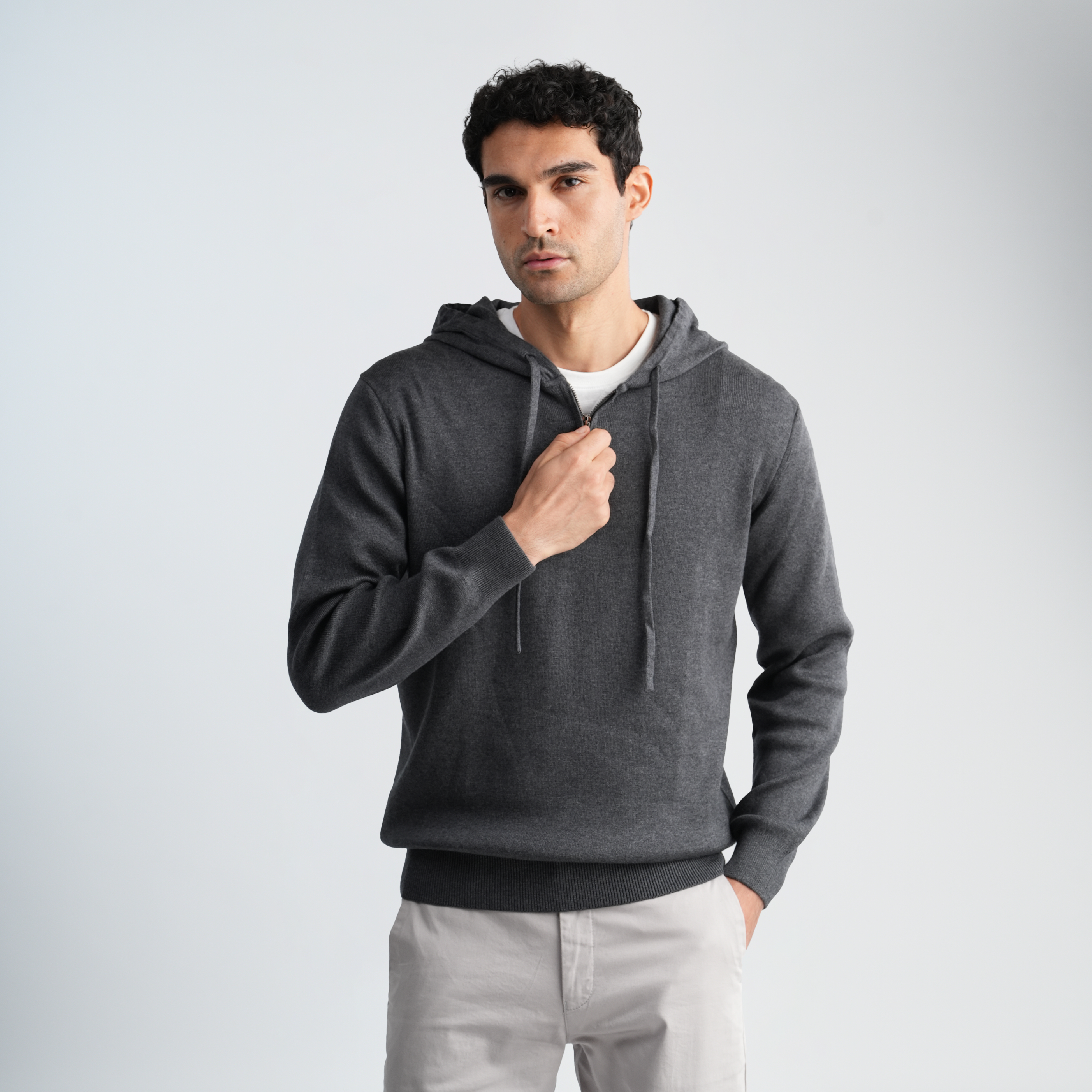 This hoodie is defined by its versatile charcoal grey color and premium fine-gauge knit fabric, which provides a soft, sweater-like feel far beyond a standard fleece sweatshirt. It features a stylish quarter-zip placket finished with a distinctive leather pull tab, and an attached hood with adjustable drawstrings.
