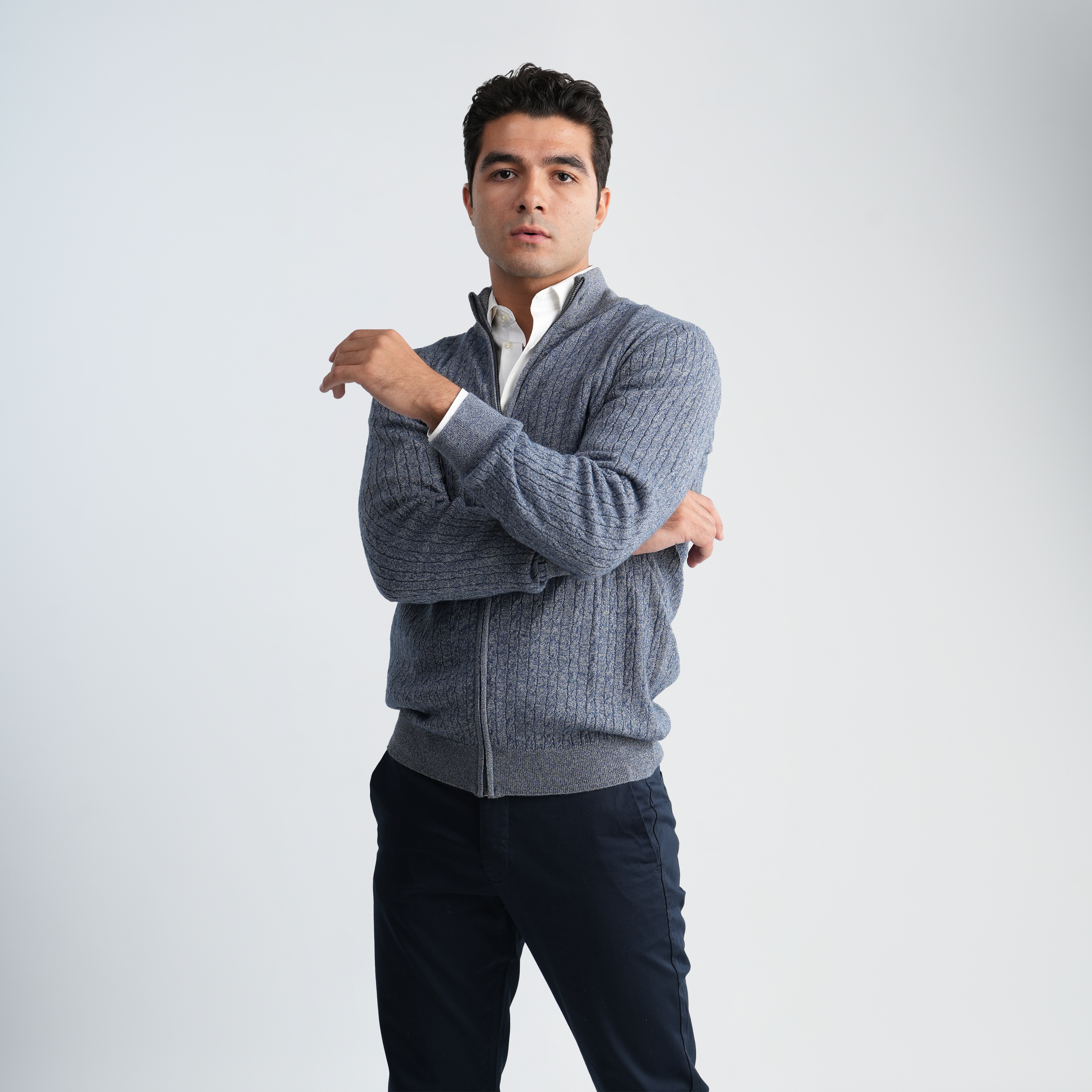 This knit is defined by its beautiful heathered light blue color and distinctive cable knit texture, which adds classic character and superior warmth. It features a sharp mock neck collar and a full zip-front closure finished with a premium leather pull tab. It's impeccably styled here over a white collared shirt, showcasing its smart-casual appeal.