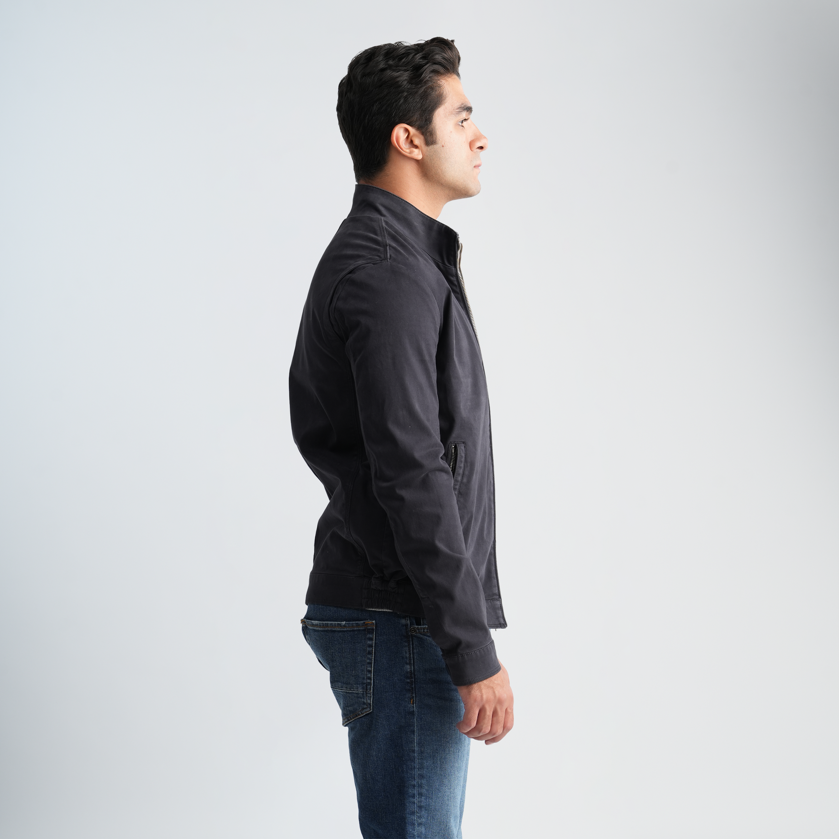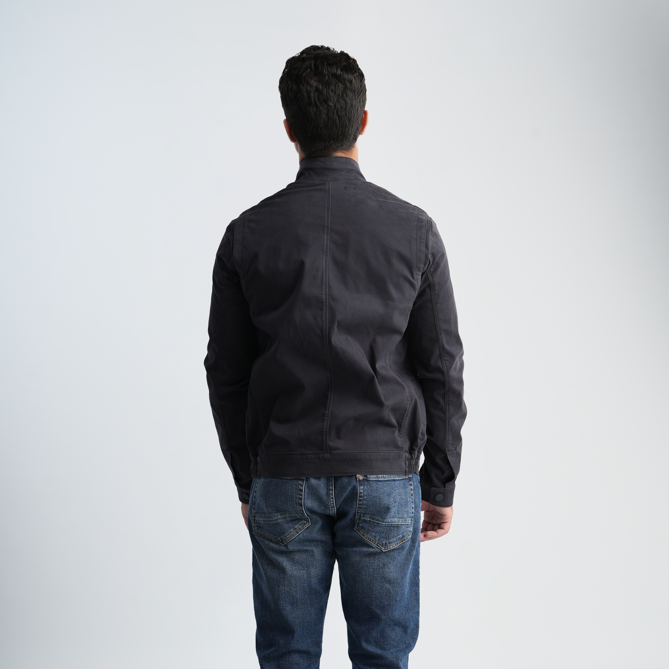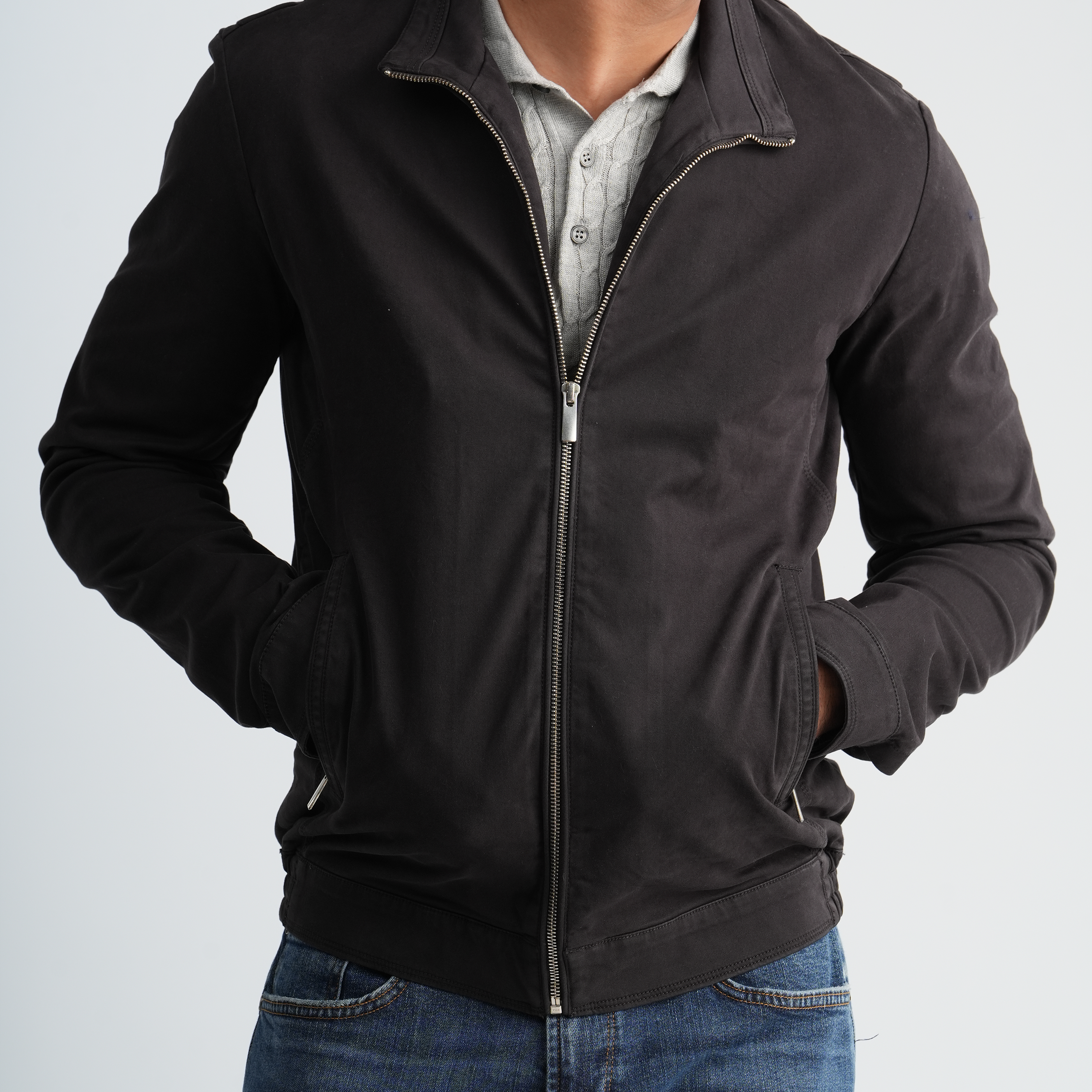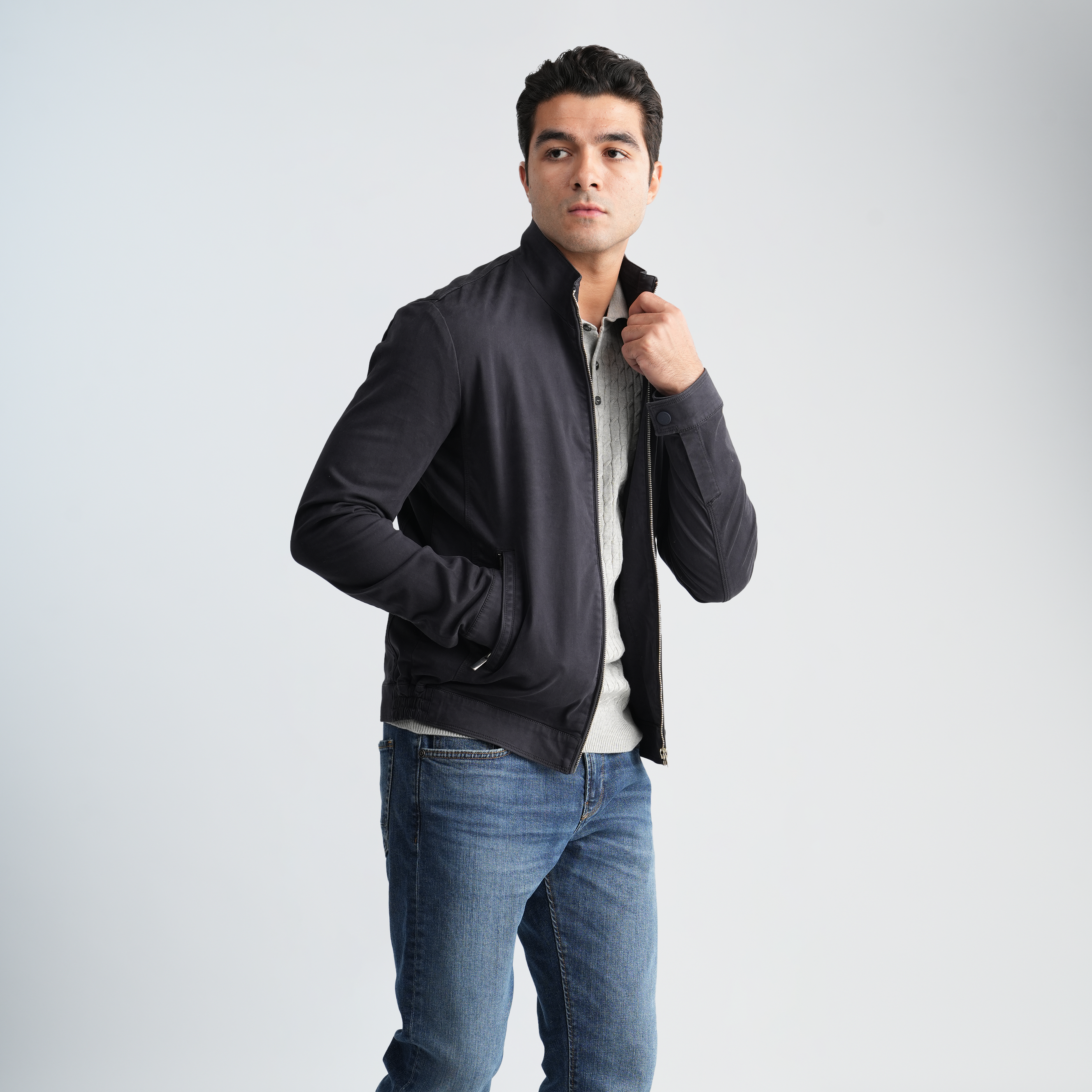 It comes in a crisp, dark colors and is made from a smooth, durable cotton blend or technical fabric that provides excellent structure without bulk. It features a full front zipper closure, a sharp stand collar (or mock neck), and a clean, banded hem and cuffs. Its minimalist design makes it incredibly versatile.
