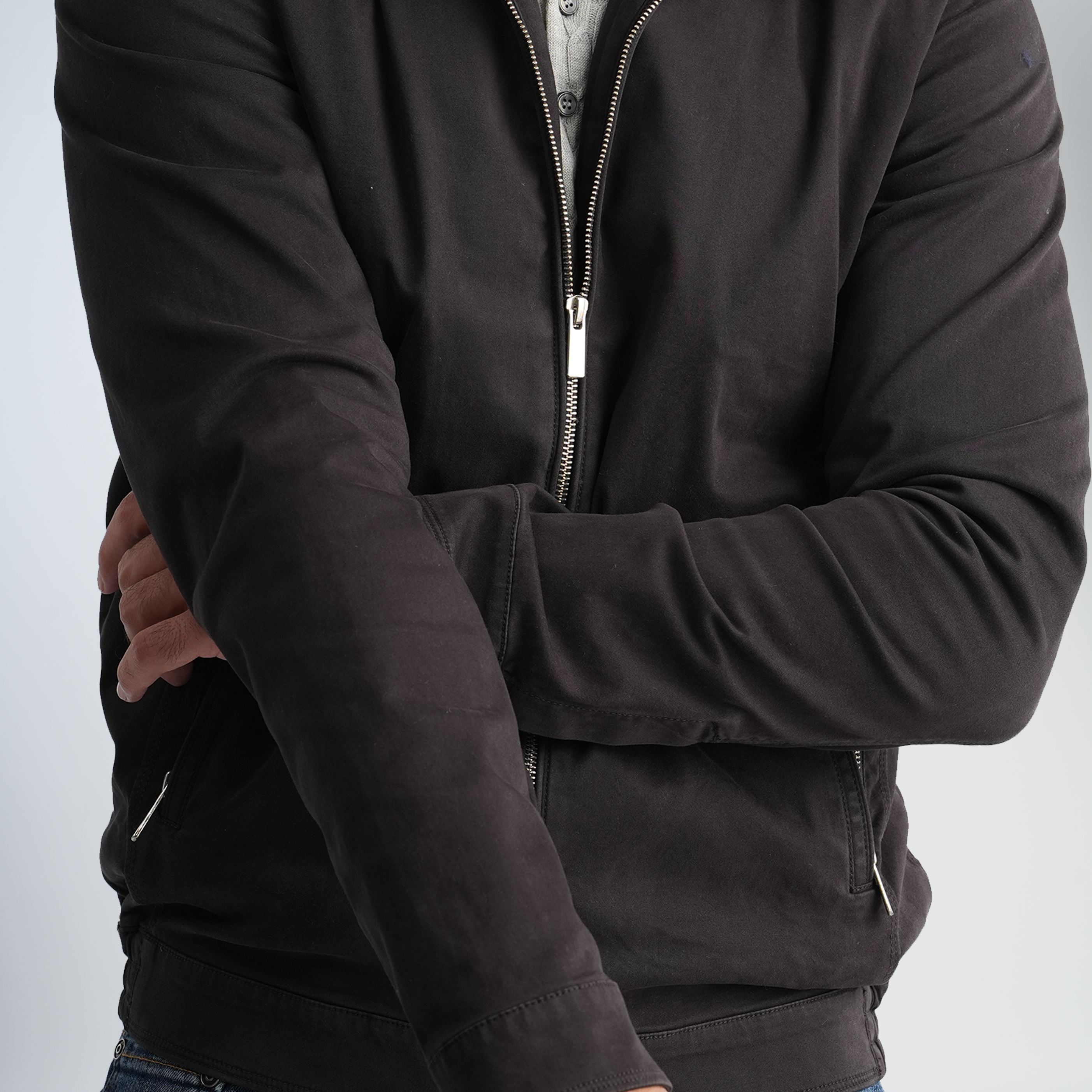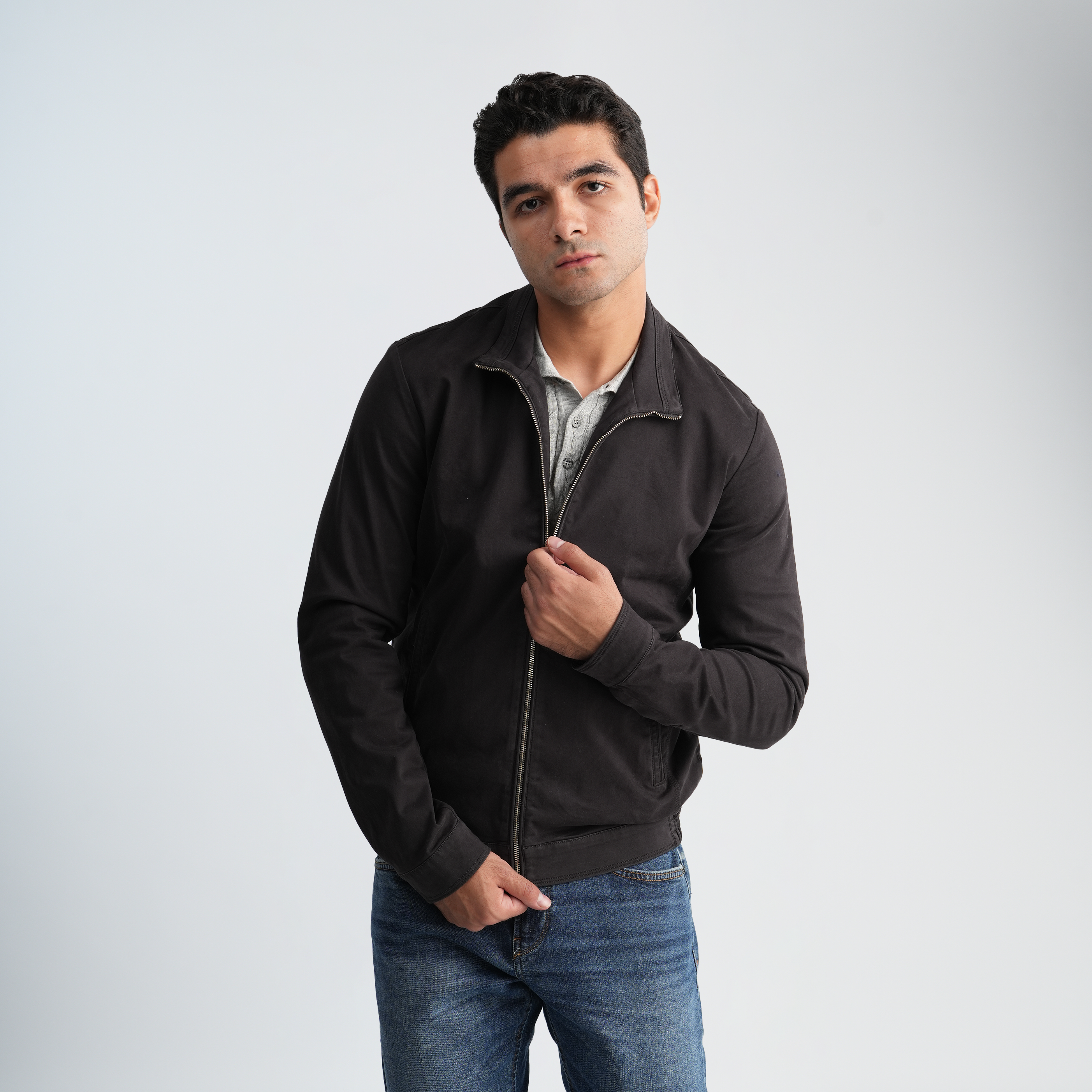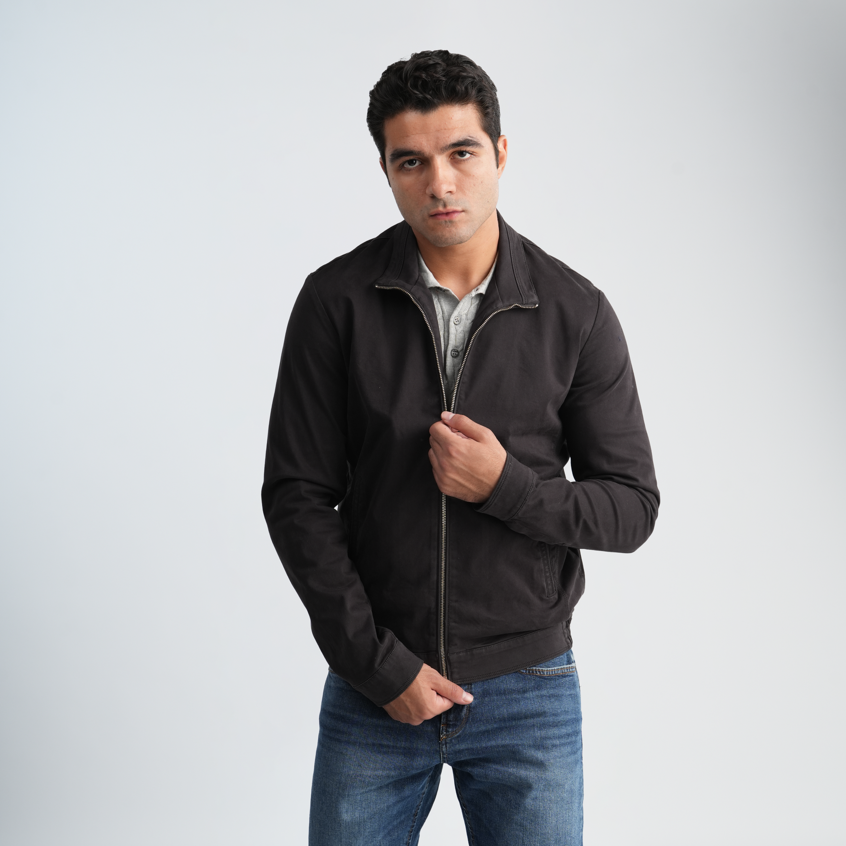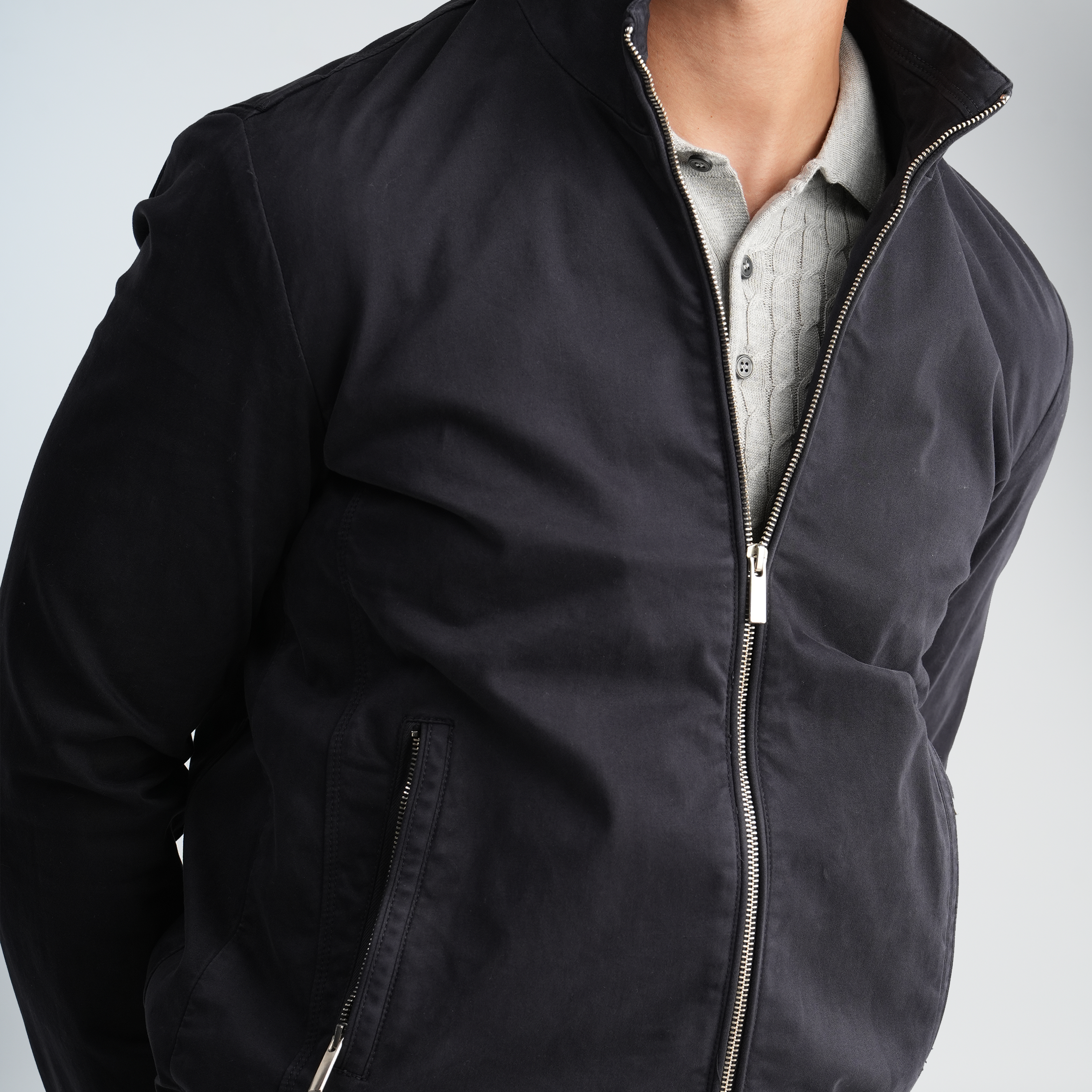 It comes in a crisp, dark colors and is made from a smooth, durable cotton blend or technical fabric that provides excellent structure without bulk. It features a full front zipper closure, a sharp stand collar (or mock neck), and a clean, banded hem and cuffs. Its minimalist design makes it incredibly versatile.