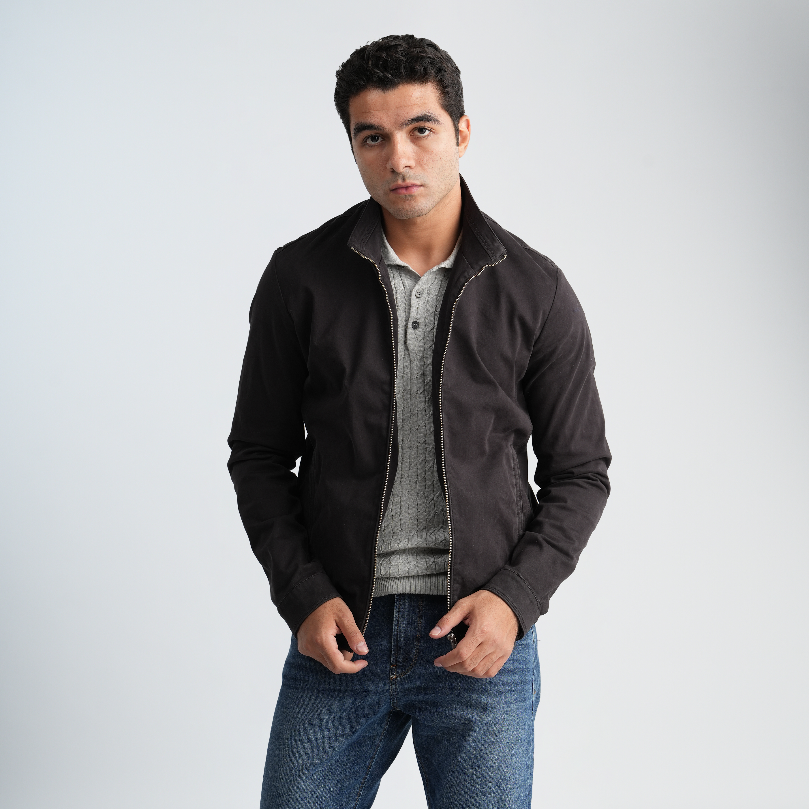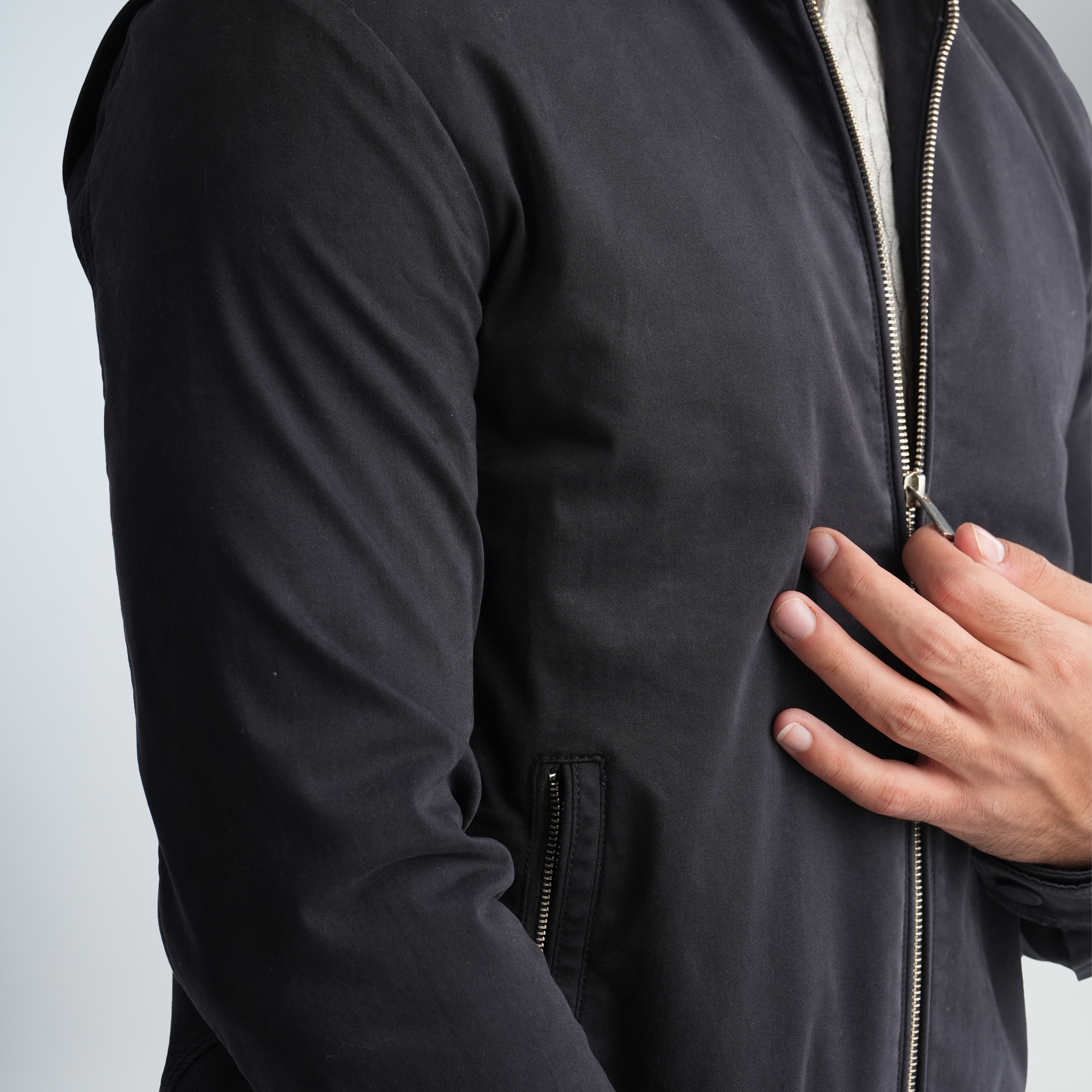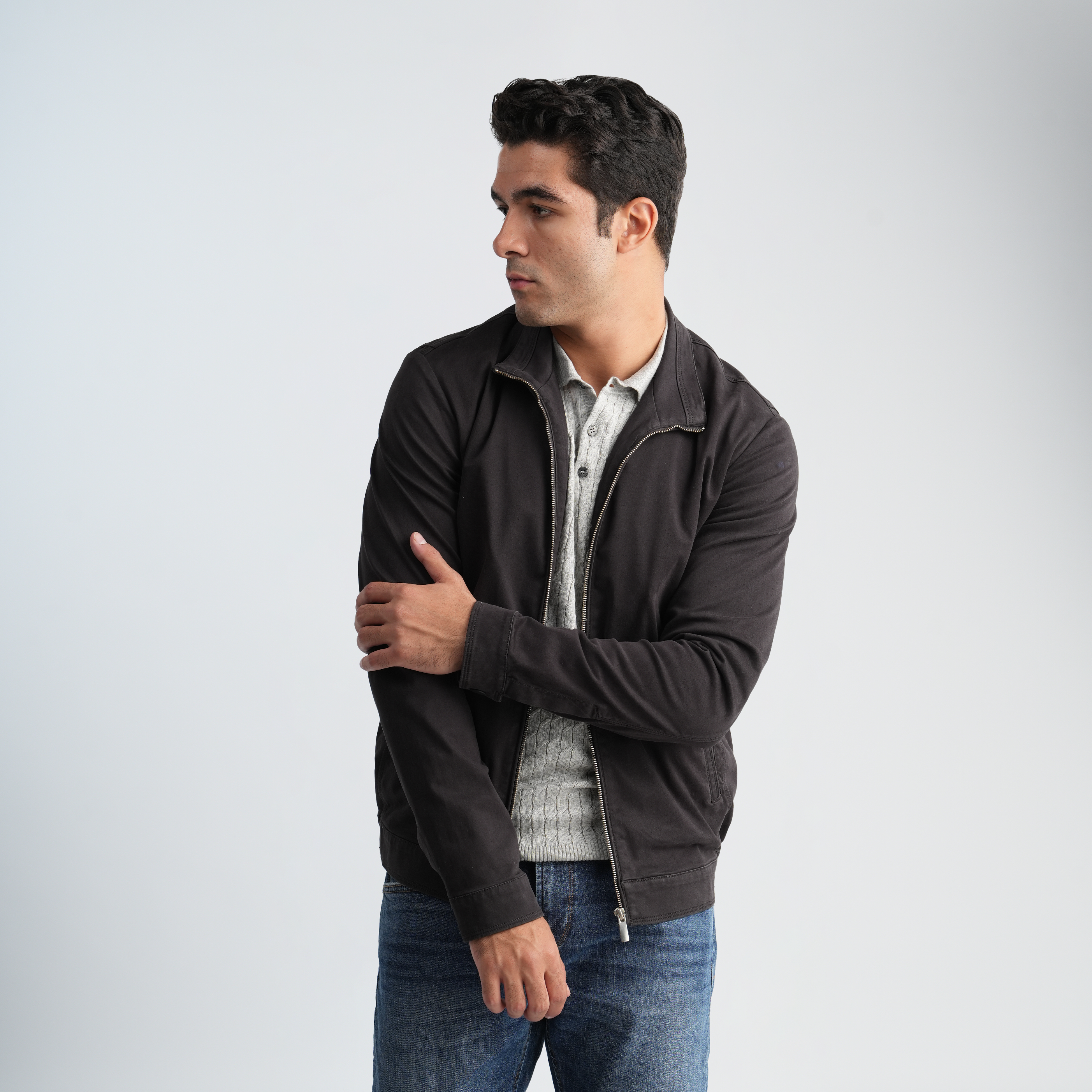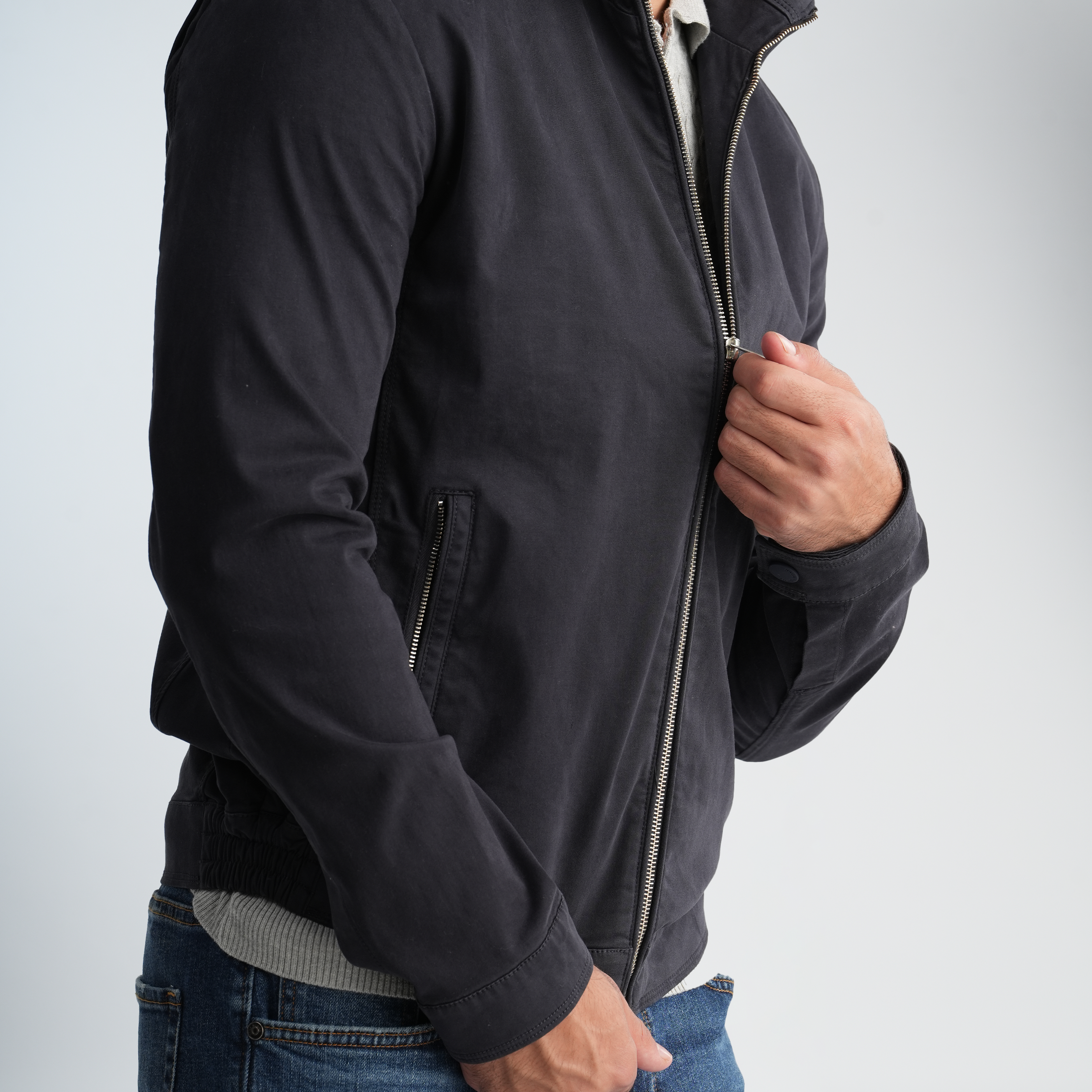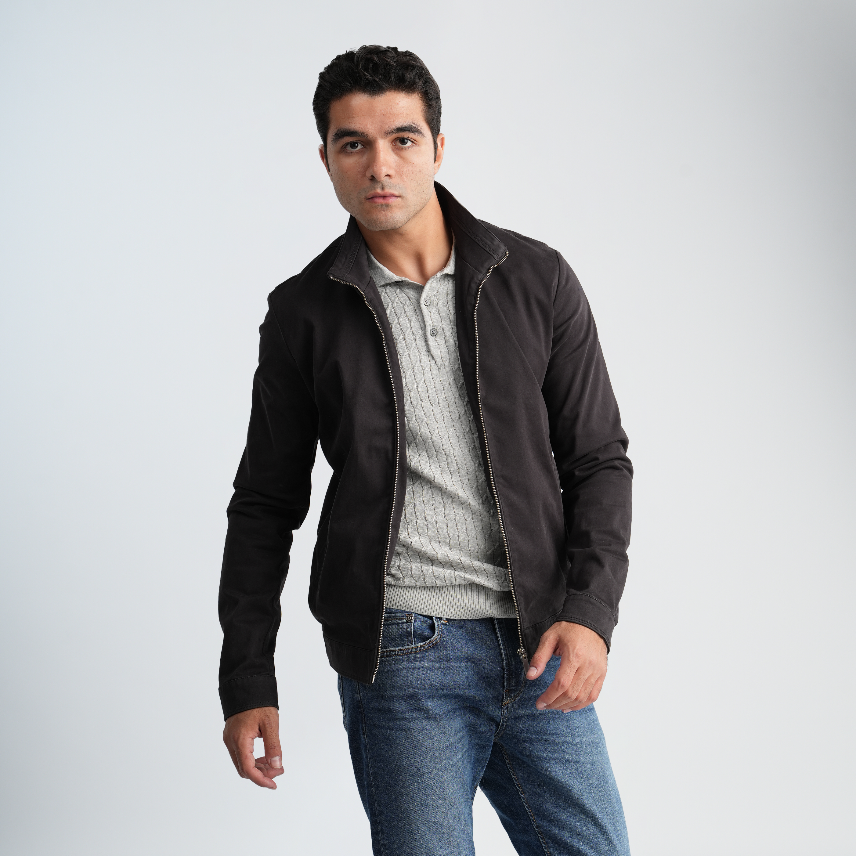It comes in a crisp, dark colors and is made from a smooth, durable cotton blend or technical fabric that provides excellent structure without bulk. It features a full front zipper closure, a sharp stand collar (or mock neck), and a clean, banded hem and cuffs. Its minimalist design makes it incredibly versatile.