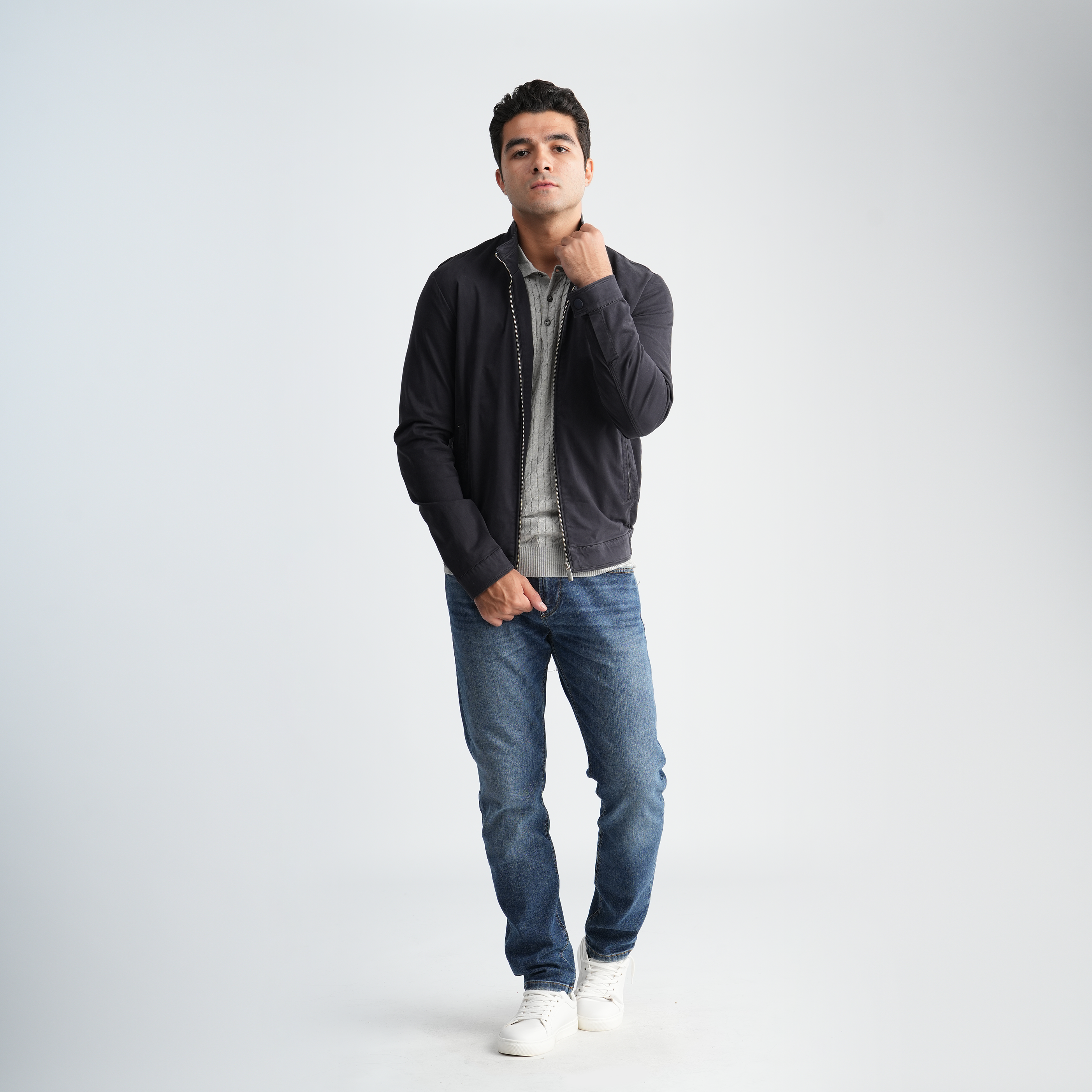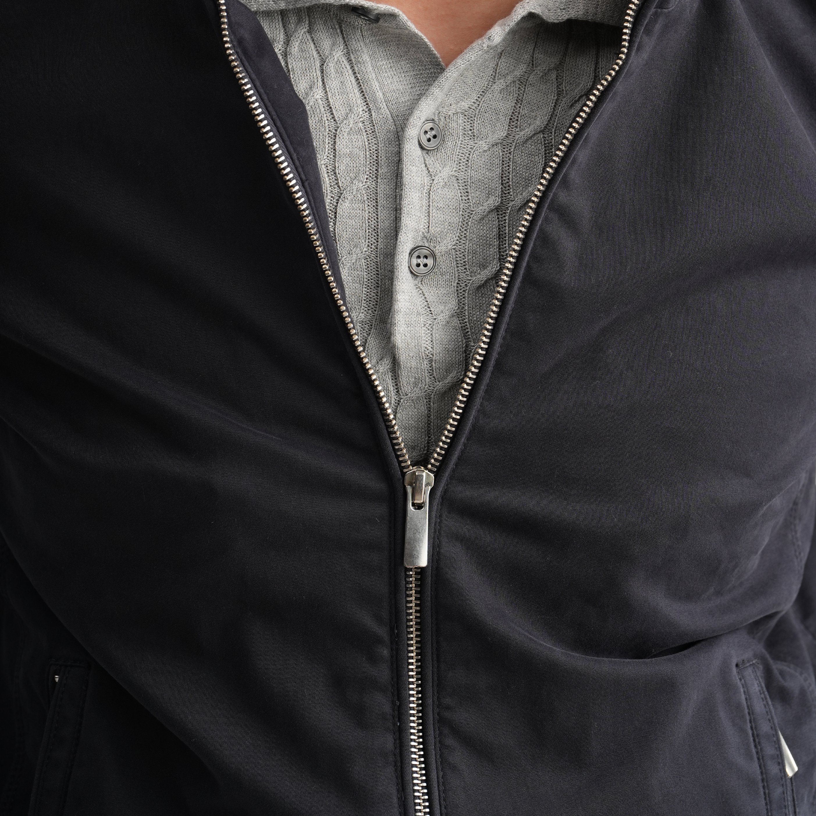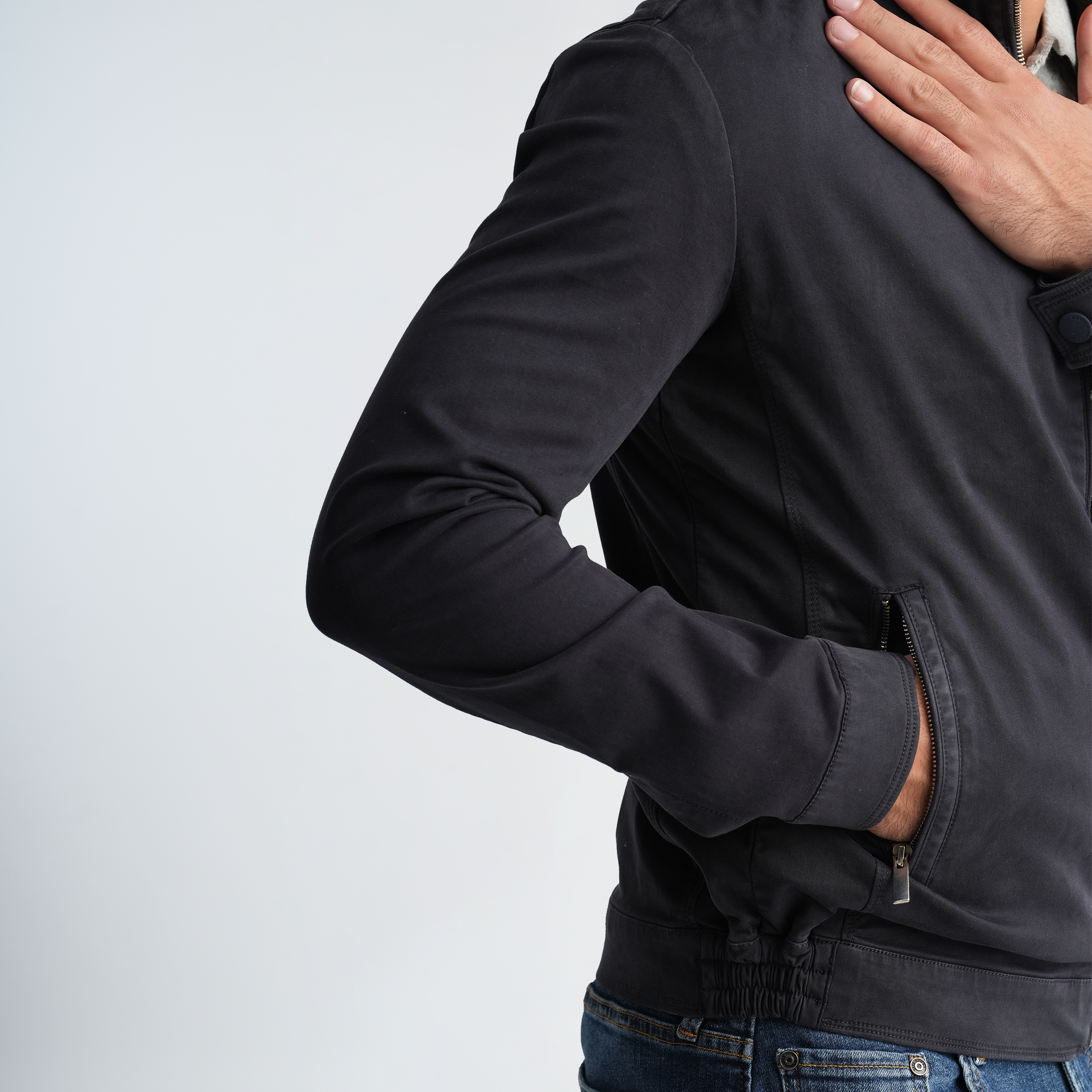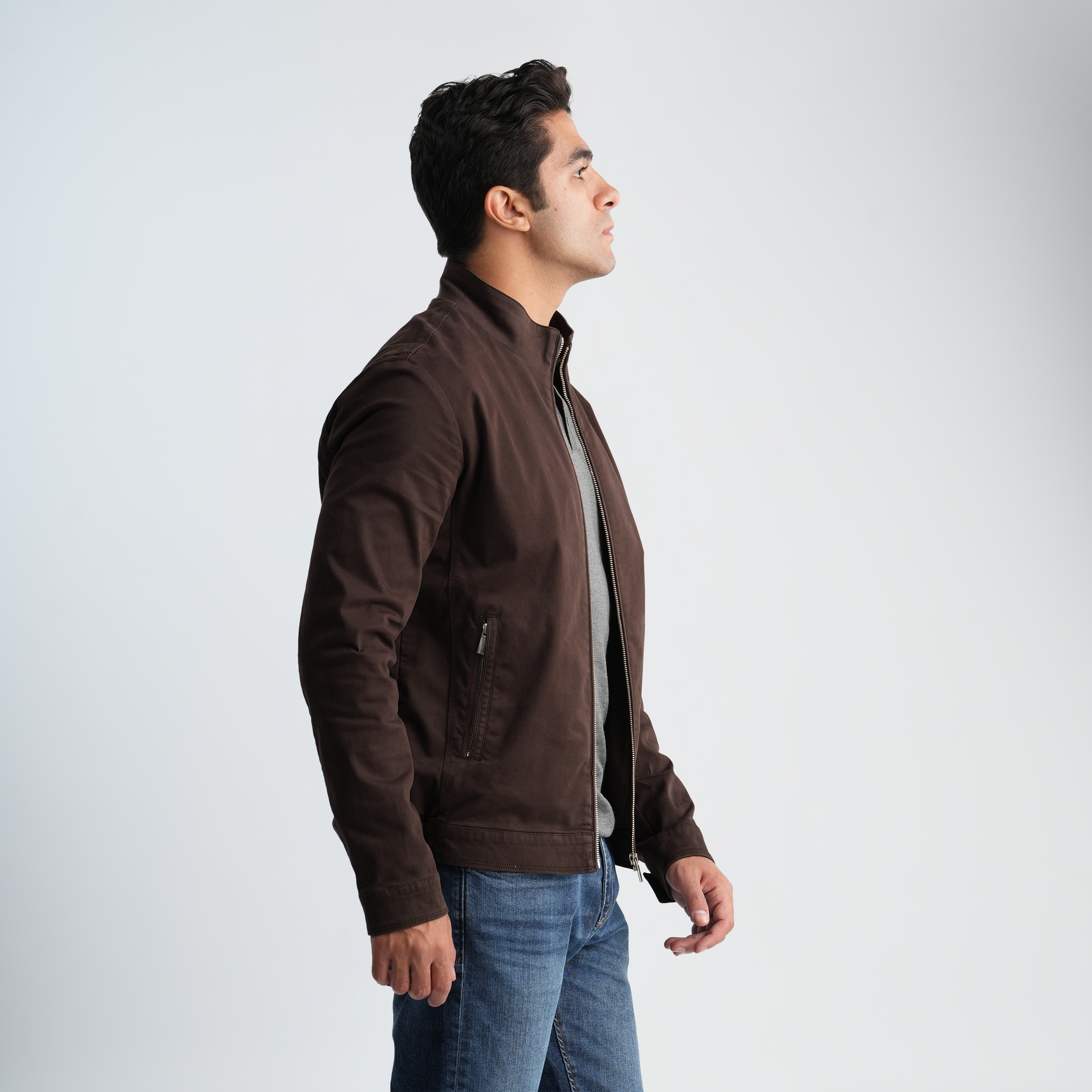 It comes in a crisp, dark colors and is made from a smooth, durable cotton blend or technical fabric that provides excellent structure without bulk. It features a full front zipper closure, a sharp stand collar (or mock neck), and a clean, banded hem and cuffs. Its minimalist design makes it incredibly versatile.