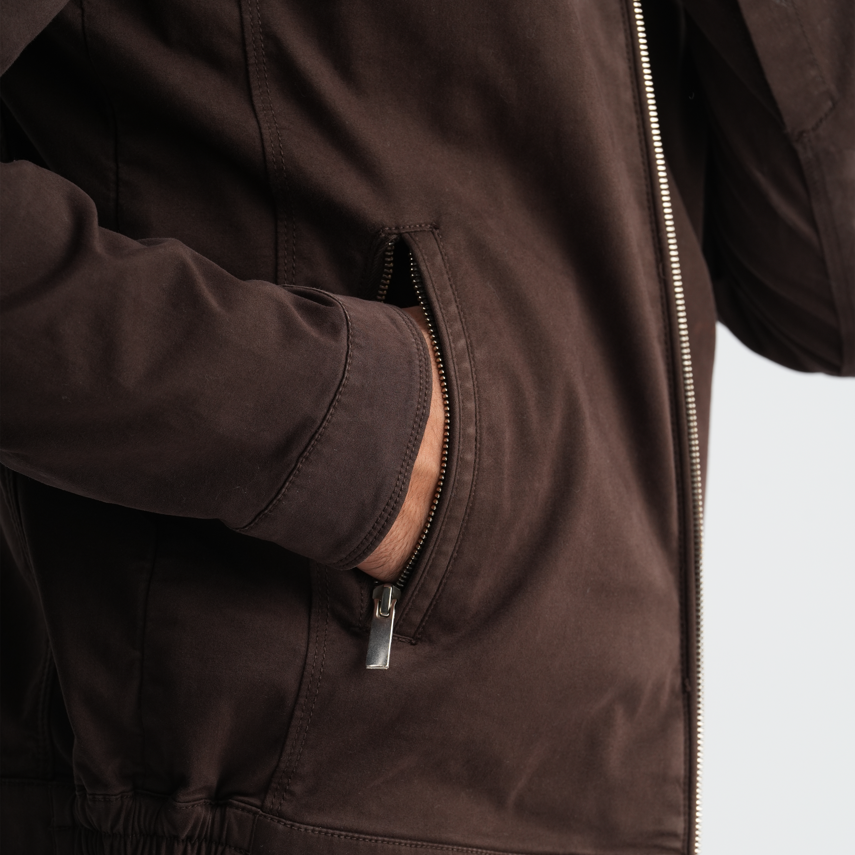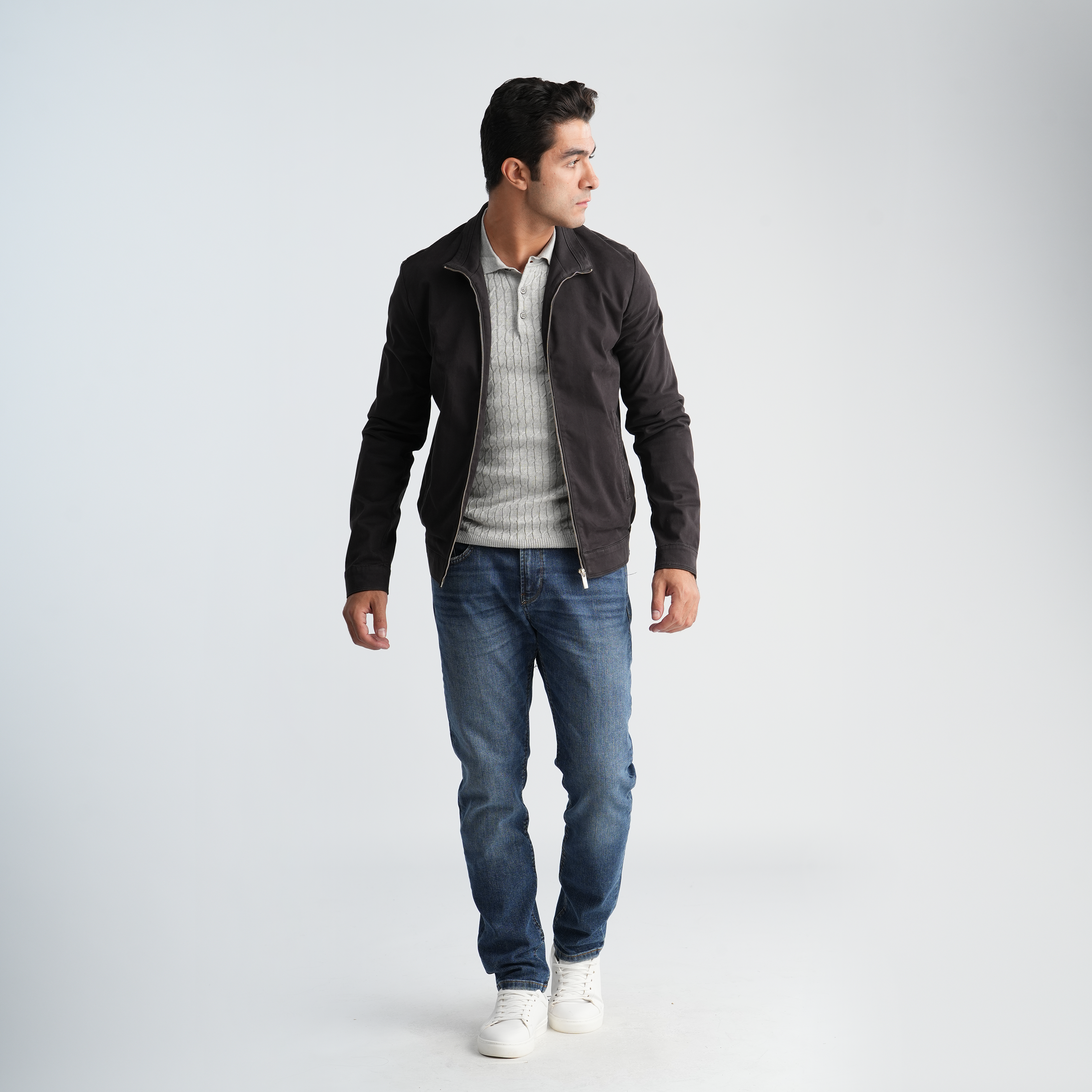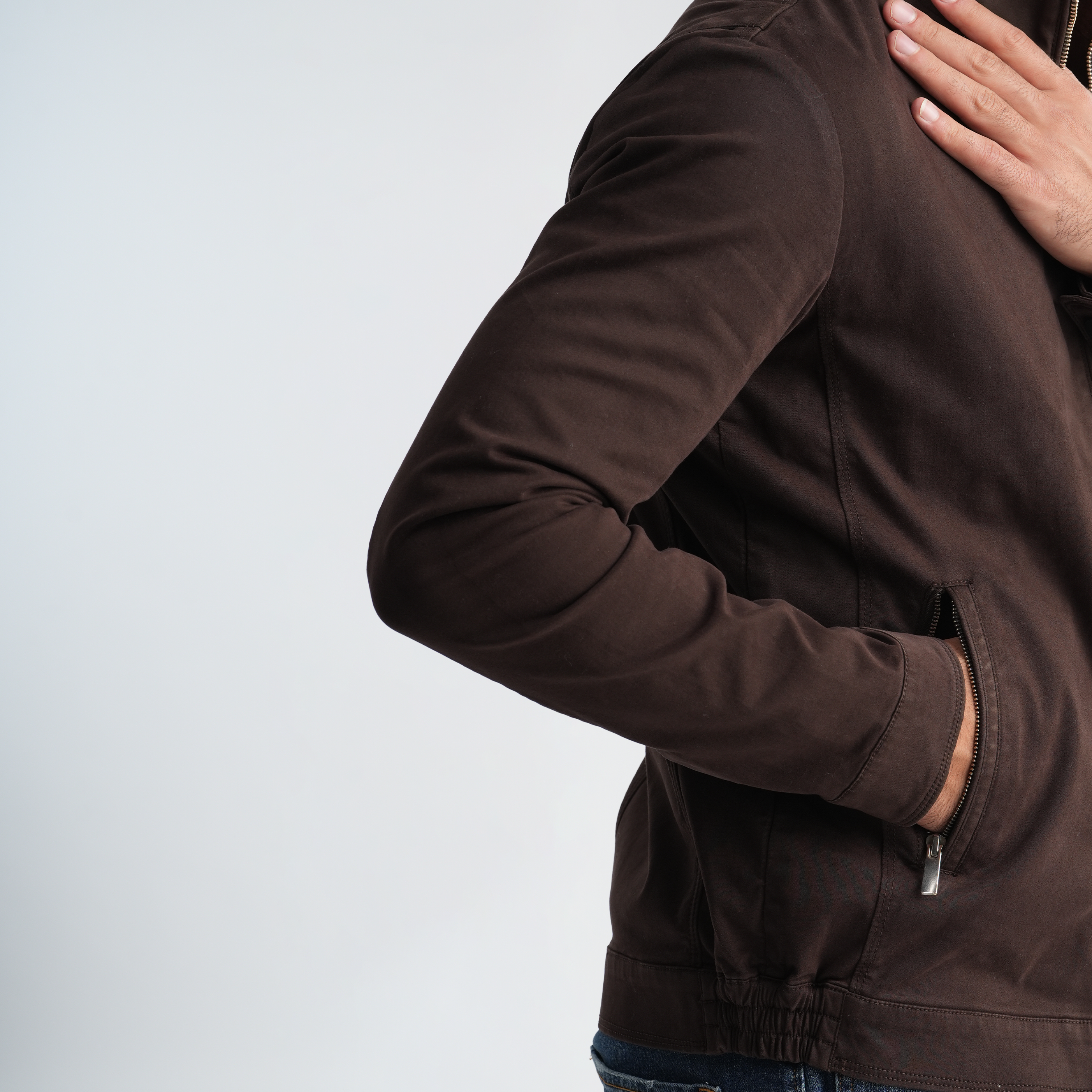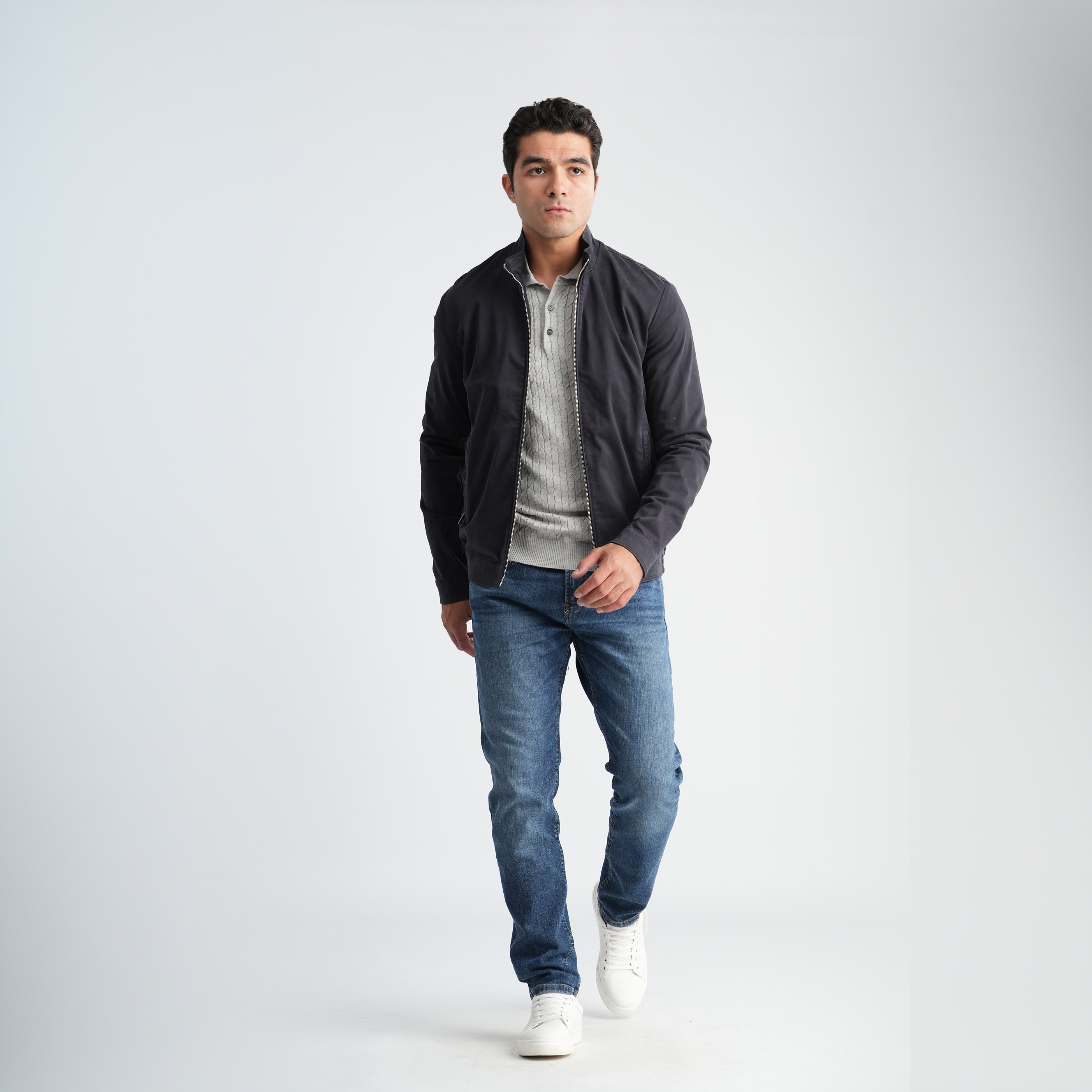 It comes in a crisp, dark colors and is made from a smooth, durable cotton blend or technical fabric that provides excellent structure without bulk. It features a full front zipper closure, a sharp stand collar (or mock neck), and a clean, banded hem and cuffs. Its minimalist design makes it incredibly versatile.