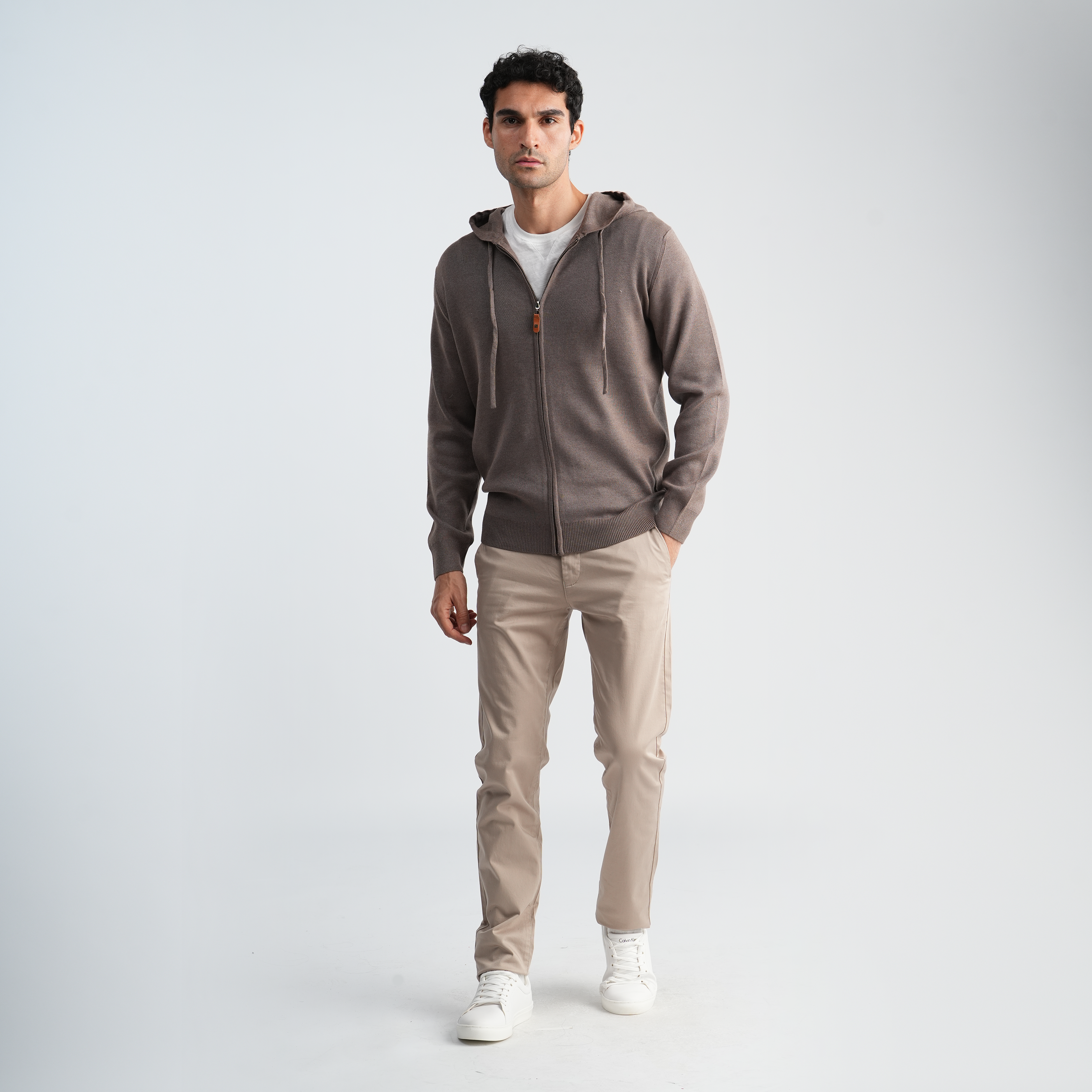 It comes in a sophisticated Coffee (medium brown/taupe) color and is made from a soft, fine knit material (a blend of cotton, wool, or synthetic fibers) for a sleek, non-bulky look. It features a full zipper closure with a premium leather pull-tab, an adjustable drawstring hood, and subtle pockets integrated into the side seams.