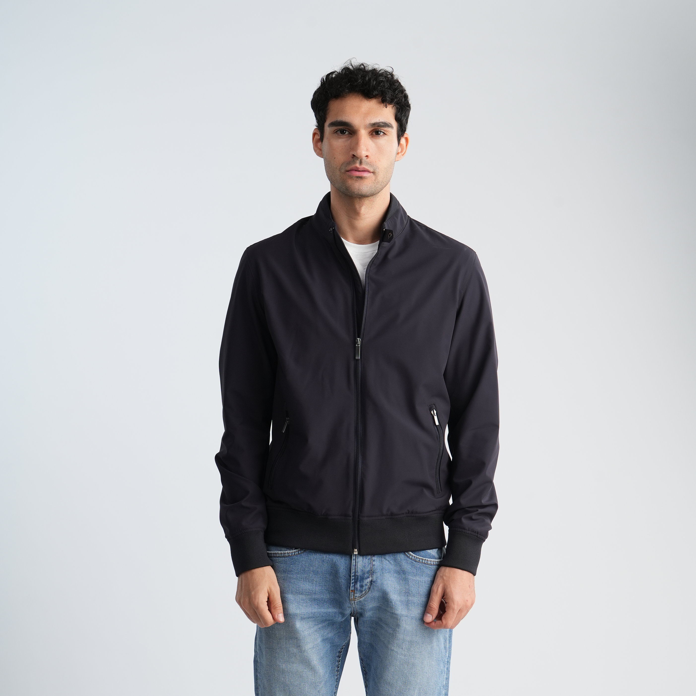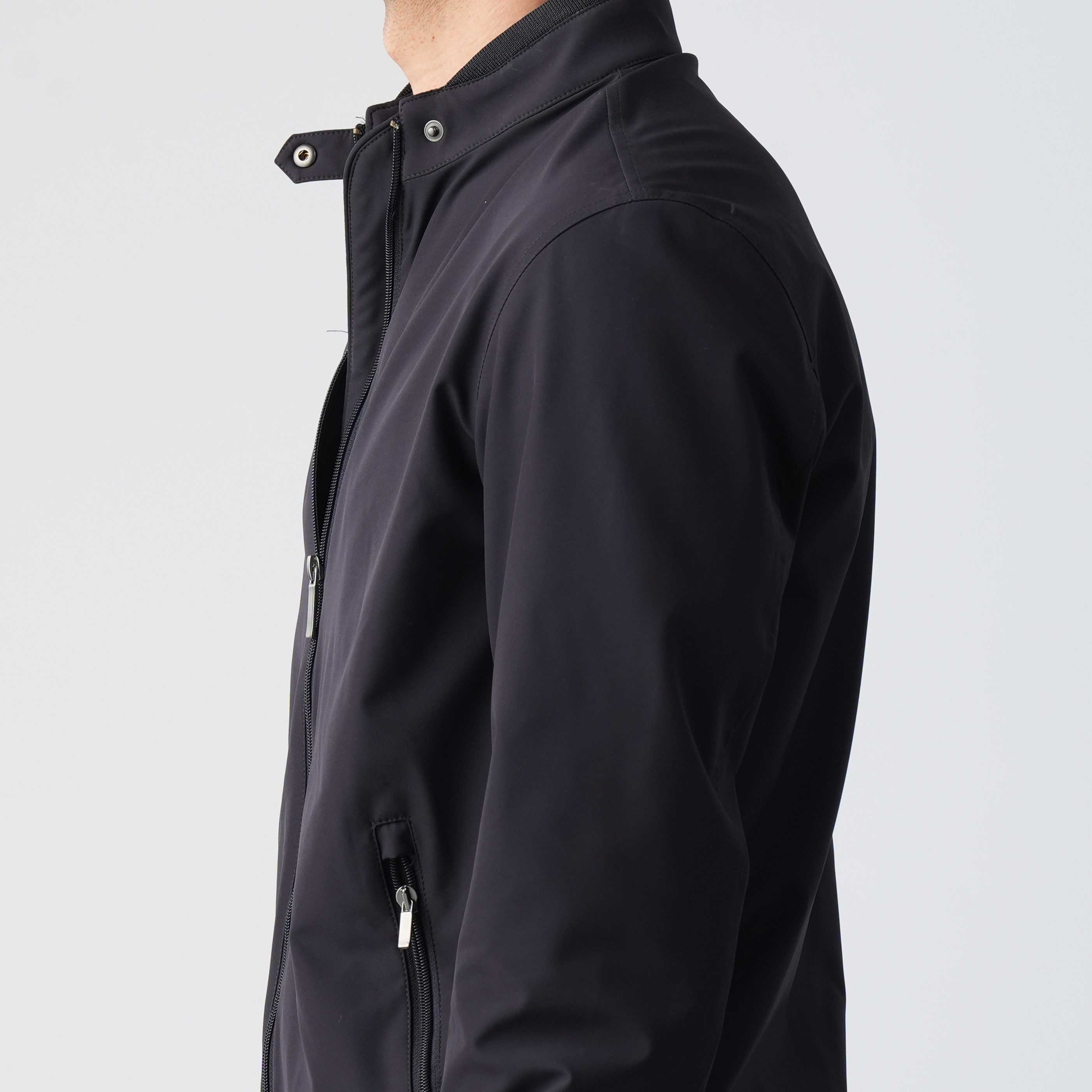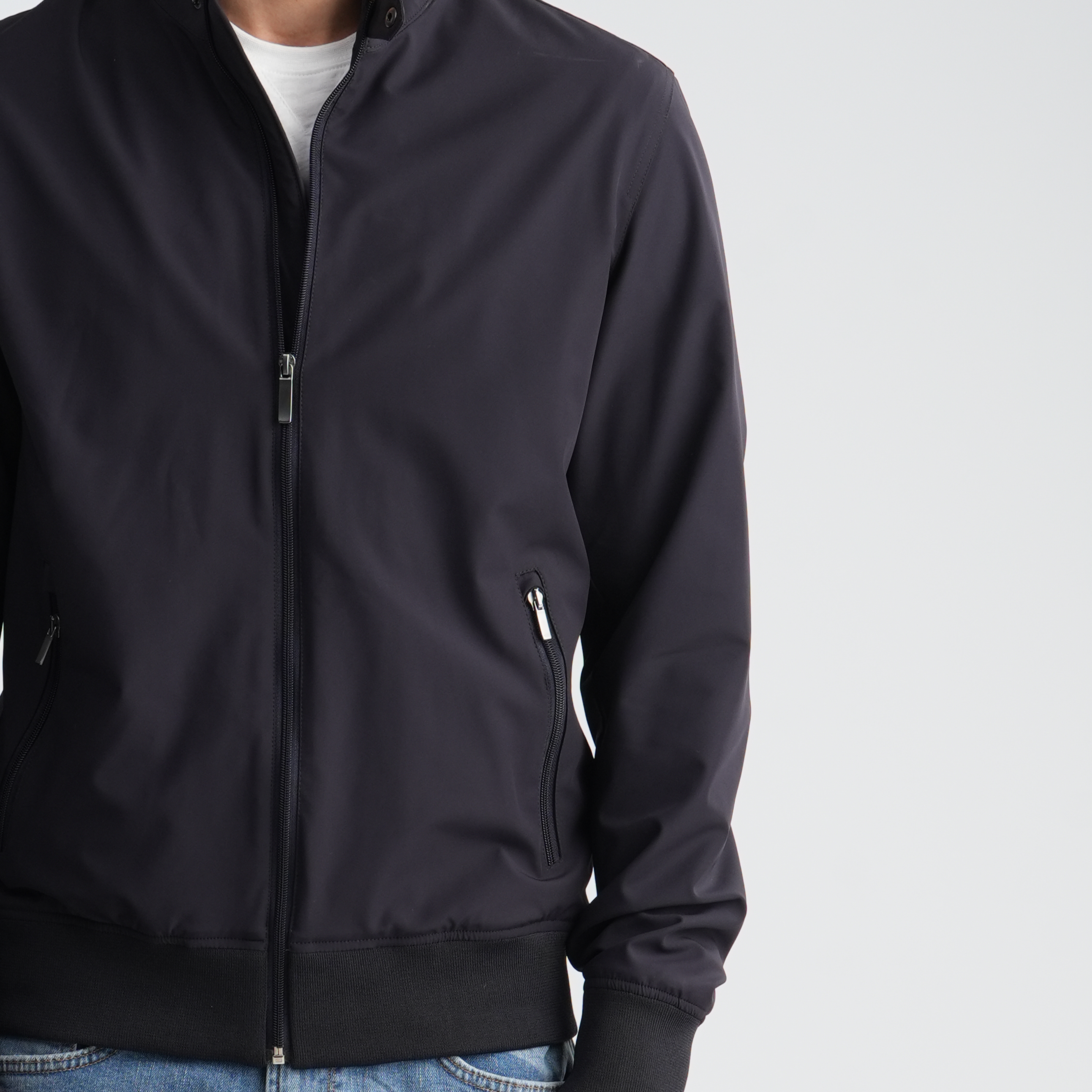 It comes in a deep Navy color and is made from a smooth, durable technical or woven fabric. It features a full front zipper closure, a structured stand collar (or mock neck), and ribbed cuffs and hem for a snug, classic fit. Zippered side pockets add practical utility and style.